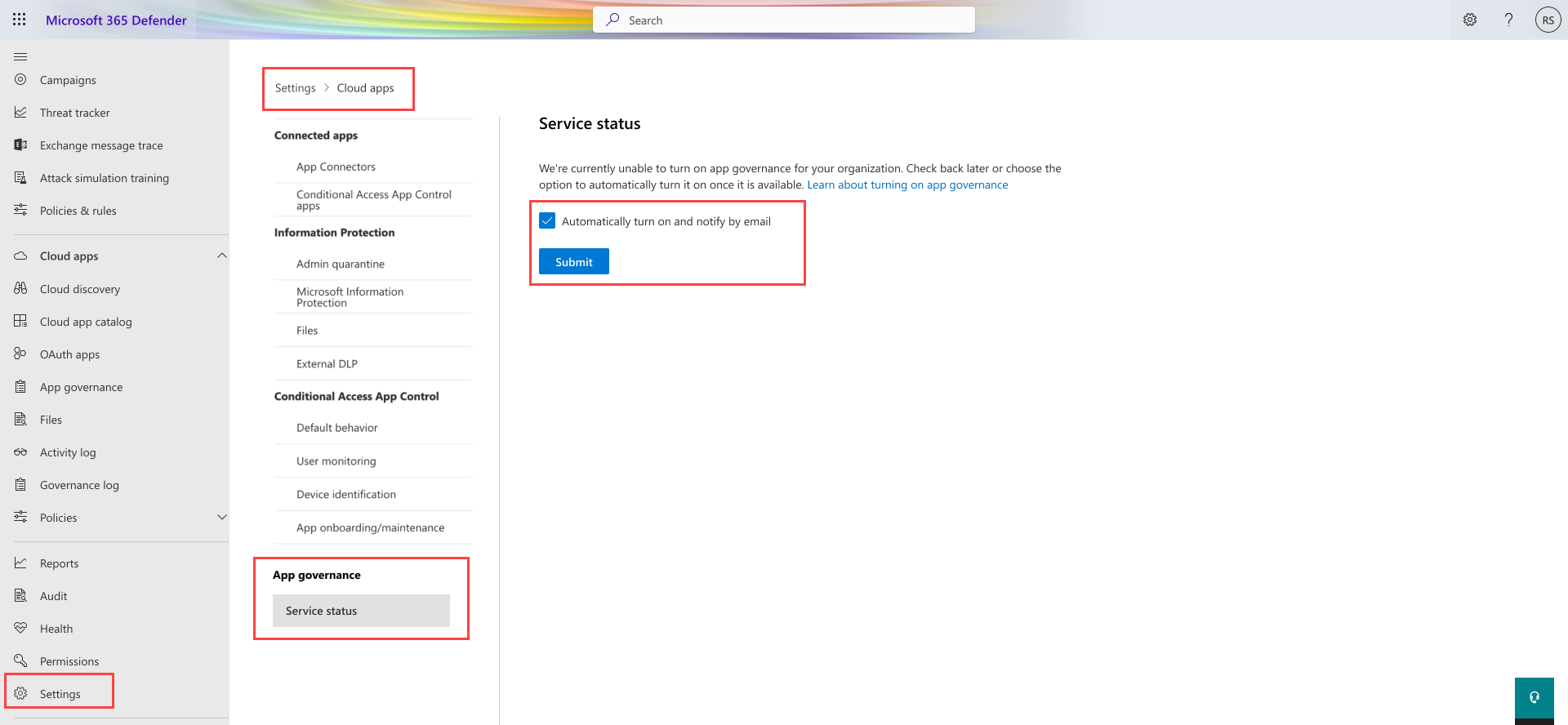 Las alertas de gobernanza de aplicaciones no fluirá a Microsoft Defender XDR ni se mostrarán en la gobernanza de aplicaciones hasta que haya aprovisionado Defender for Cloud Apps y Microsoft Defender XDR accediendo a sus respectivos portales al menos una vez.