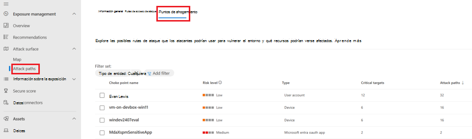Vaya a Administración de > la exposición Rutas de ataque de superficie > expuesta a ataques.