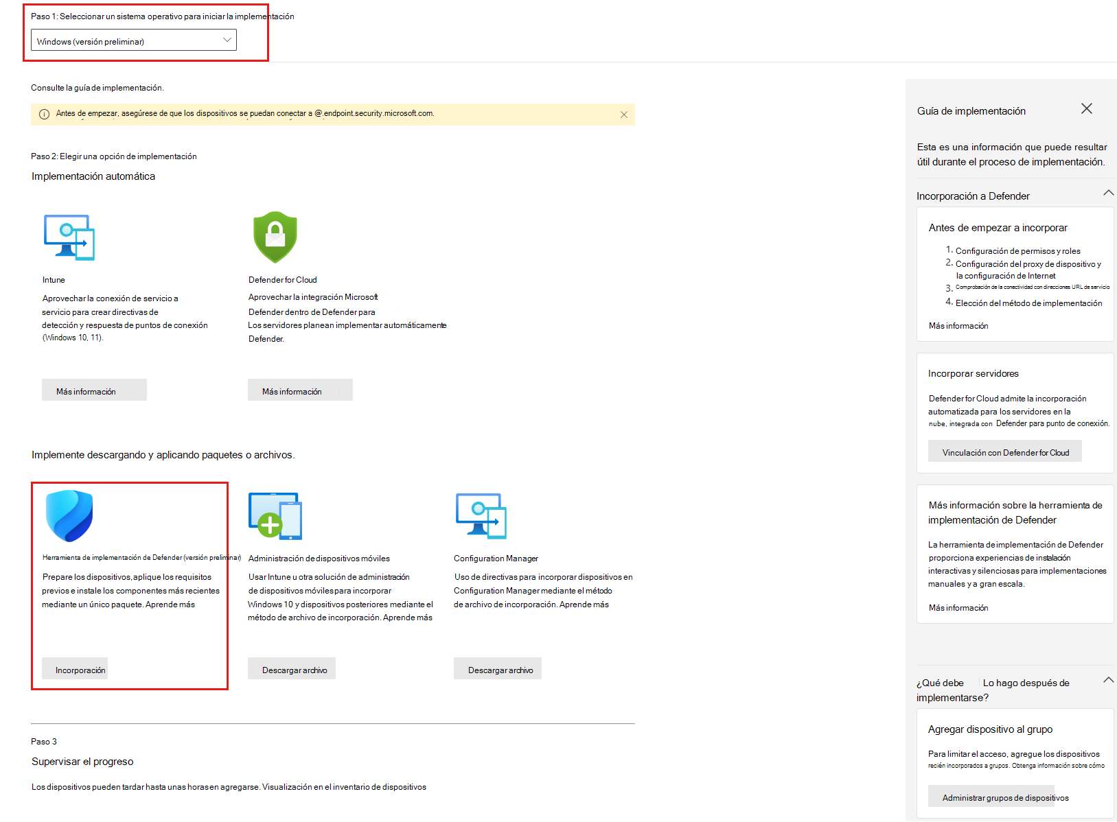 La solución de seguridad de punto de conexión de Defender que la herramienta de implementación instala en dispositivos Windows 7 SP1 y Windows Server 2008 R2 SP1 está en versión preliminar y es diferente a la de las versiones más recientes de Windows y Windows Server. Para obtener más información, consulte Implementación de la solución de seguridad de puntos de conexión de Defender para dispositivos Windows 7 SP1 y Windows Server 2008 R2 SP1.