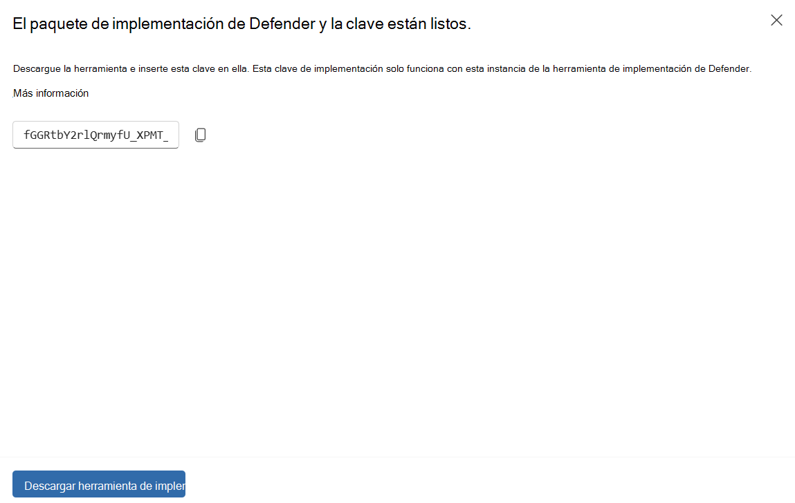 | Entrada de clave de implementación | Para agregar barreras al proceso de incorporación y evitar la incorporación accidental, el uso de la herramienta de implementación de Defender requiere escribir una clave generada en la página de incorporación del portal. |