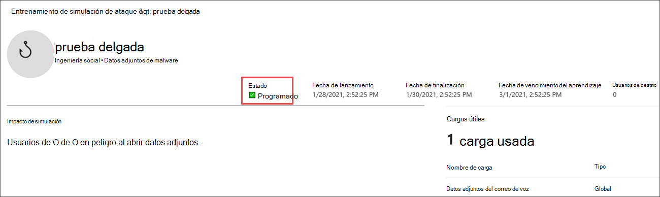 R: Sí. En la última página Revisar simulación del asistente para nueva simulación, seleccione Enviar una prueba. Esta opción envía un mensaje de simulación de suplantación de identidad (phishing) de ejemplo al usuario que ha iniciado sesión actualmente. Después de validar el mensaje de suplantación de identidad en la Bandeja de entrada, puede enviar la simulación.