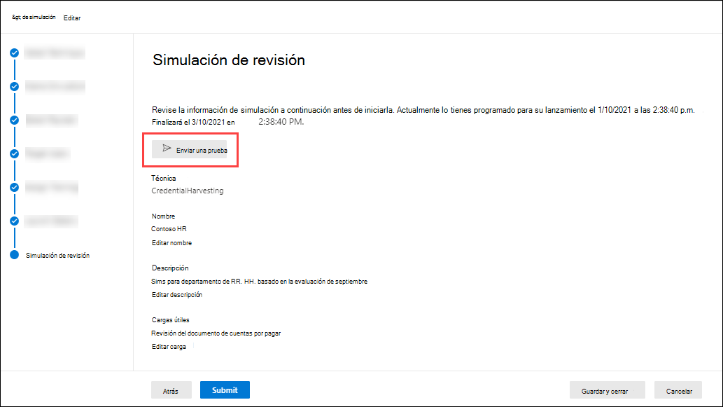 - Revise y modifique la configuración de simulación según sea necesario. Seleccione Enviar para iniciarlo o Guardar y cerrar para revisarlo más adelante. Si selecciona Cancelar, la simulación copiada no se guardará.
