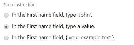 User-supplied value label This step instruction contains placeholder text, which the author can fill in with their own text. For steps which have an Example value label option, the placeholder allows substituting the text which normally specifies the data to enter. This is useful for scenarios where neither the Preferred value label nor the Example value label sufficiently express the data that should be used for this step.