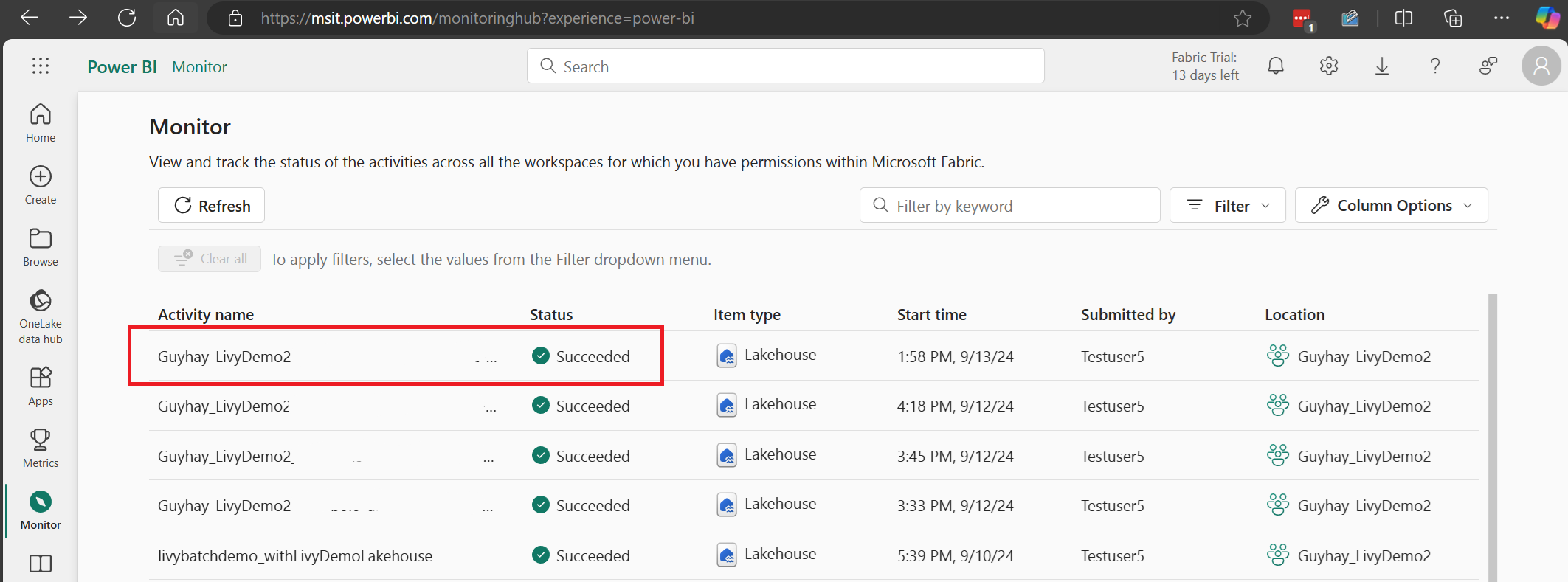 Puede acceder al centro de supervisión para ver varias actividades de Apache Spark al seleccionar Supervisar en los vínculos de navegación del lado izquierdo.