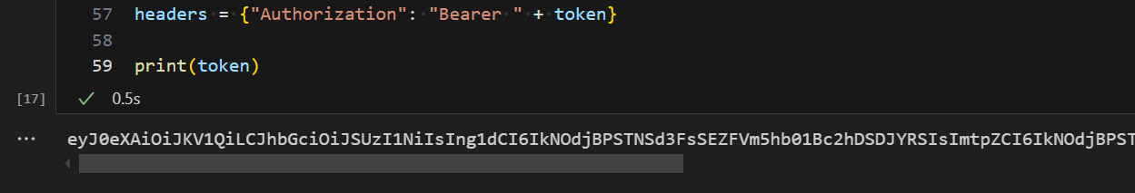 .ipynben Visual Studio Code e inserte el código siguiente.from msal import PublicClientApplication import requests import time # Configuration - Replace with your actual values tenant_id = "Entra_TenantID" # Microsoft Entra tenant ID client_id = "Entra_ClientID" # Application ID (can be the same as above or different) # Required scopes for Microsoft Fabric API access scopes = [ "https://api.fabric.microsoft.com/Lakehouse.Execute.All", # Execute operations in lakehouses "https://api.fabric.microsoft.com/Lakehouse.Read.All", # Read lakehouse metadata "https://api.fabric.microsoft.com/Item.ReadWrite.All", # Read/write fabric items "https://api.fabric.microsoft.com/Workspace.ReadWrite.All", # Access workspace operations "https://api.fabric.microsoft.com/Code.AccessStorage.All", # Access storage from code "https://api.fabric.microsoft.com/Code.AccessAzureKeyvault.All", # Access Azure Key Vault "https://api.fabric.microsoft.com/Code.AccessAzureDataExplorer.All", # Access Azure Data Explorer "https://api.fabric.microsoft.com/Code.AccessAzureDataLake.All", # Access Azure Data Lake "https://api.fabric.microsoft.com/Code.AccessFabric.All" # General Fabric access ] def get_access_token(tenant_id, client_id, scopes): """ Get an access token using interactive authentication. This method will open a browser window for user authentication. Args: tenant_id (str): The Microsoft Entra tenant ID client_id (str): The application client ID scopes (list): List of required permission scopes Returns: str: The access token, or None if authentication fails """ app = PublicClientApplication( client_id, authority=f"https://login.microsoftonline.com/{tenant_id}" ) print("Opening browser for interactive authentication...") token_response = app.acquire_token_interactive(scopes=scopes) if "access_token" in token_response: print("Successfully authenticated") return token_response["access_token"] else: print(f"Authentication failed: {token_response.get('error_description', 'Unknown error')}") return None # Uncomment the lines below to use interactive authentication token = get_access_token(tenant_id, client_id, scopes) print("Access token acquired via interactive login")Ejecute la celda del cuaderno. Debería ver el token de Microsoft Entra devuelto.