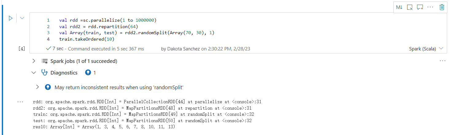 El método randomSplit() es equivalente a realizar sample() en tu marco de datos varias veces. Donde cada muestra vuelve a recuperar, particiona y ordena el data frame dentro de las particiones. La distribución de datos entre particiones y criterio de ordenación es importante para randomSplit() y sample(). Si cualquiera de los elementos cambia al actualizar los datos, puede haber duplicados o valores faltantes a través de las particiones. Y la misma muestra usando la misma semilla puede producir resultados diferentes.