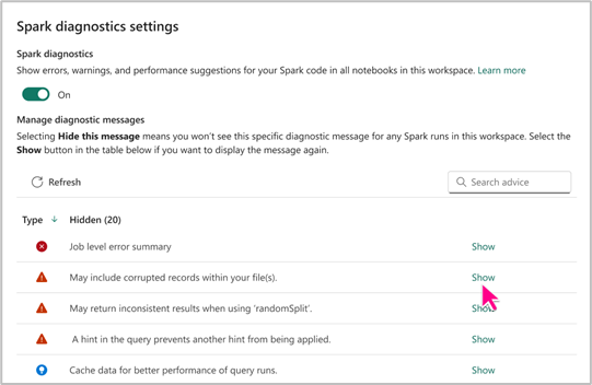 La configuración del asesor de Spark le permite elegir si mostrar u ocultar tipos específicos de consejos de Spark según sus necesidades. Además, tiene la flexibilidad de habilitar o deshabilitar el Asesor de Spark para los cuadernos dentro de un área de trabajo, en función de sus preferencias.