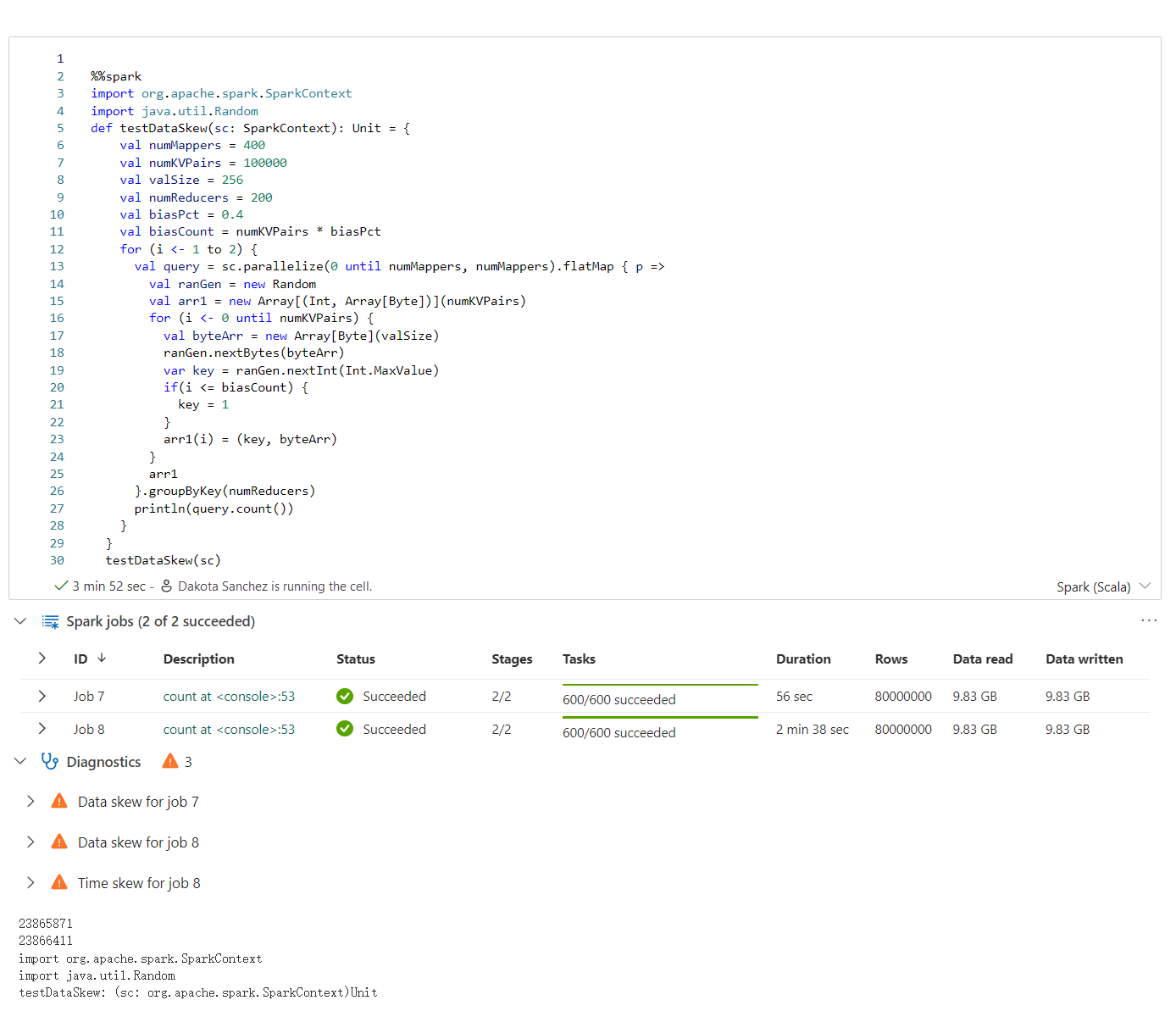 El asesor de Apache Spark muestra los consejos, incluida la información, las advertencias y los errores, en la salida de la celda de Notebook en tiempo real.