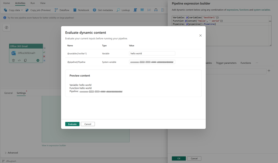 Puede usar la característica Evaluar expresión en Microsoft Fabric Data Factory para probar y depurar las expresiones de canalización. Puede comprobar las salidas de expresiones, revisar los componentes individuales y validar la lógica sin ejecutar toda la canalización.