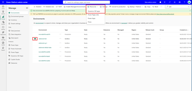 Seleccione el entorno y seleccione Resources -> Dynamics 365 apps en la barra de comandos.