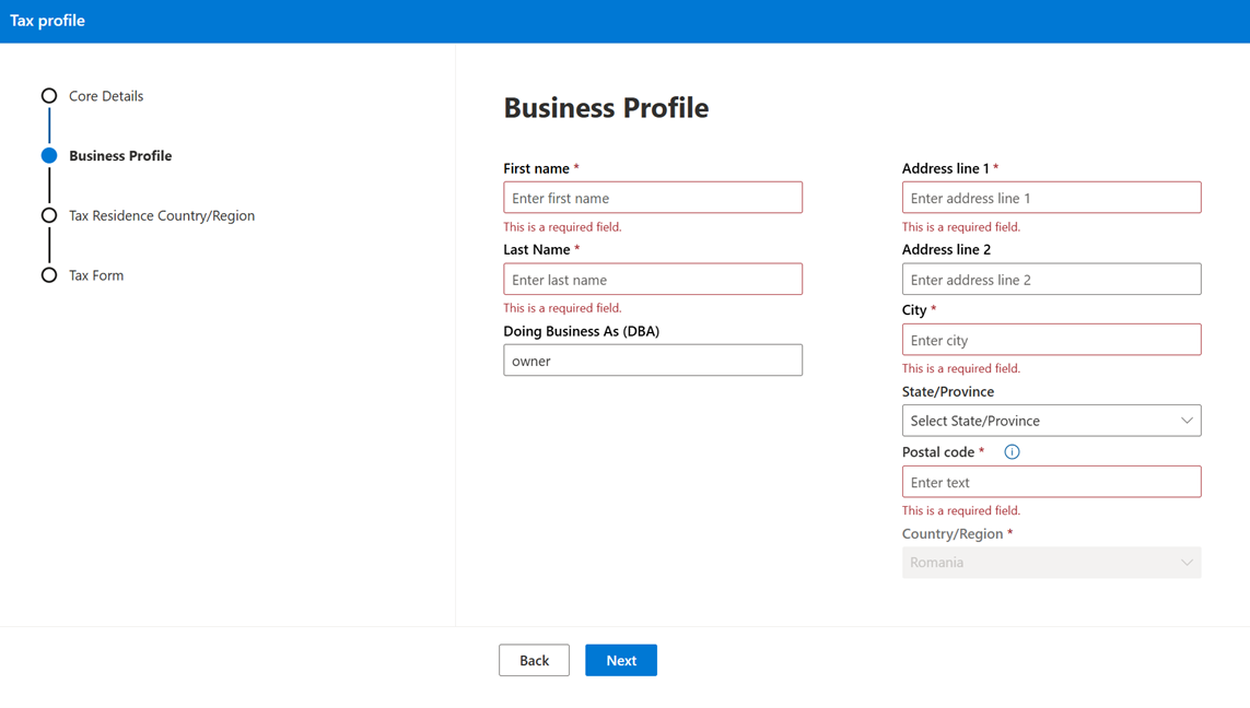 Según las selecciones del paso 6, se le pedirá que proporcione la información fiscal necesaria para su país o región. Después de completar los detalles del perfil de negocio y seleccionarlo a continuación, debe iniciar la opción formulario fiscal en la sección formulario fiscal.