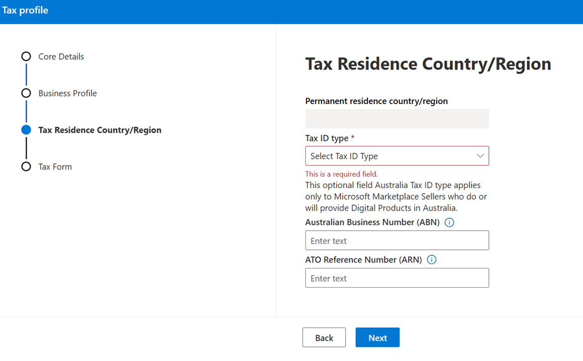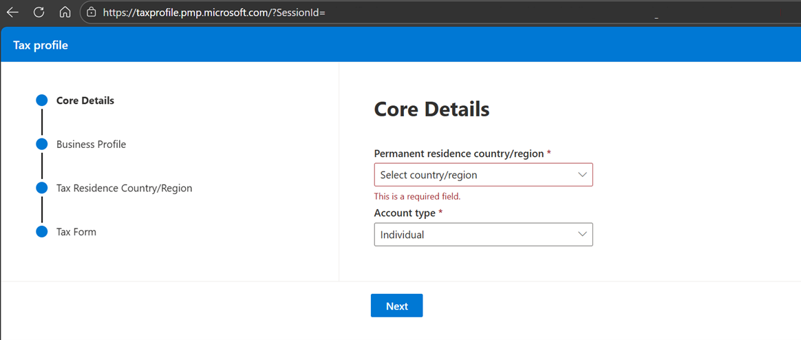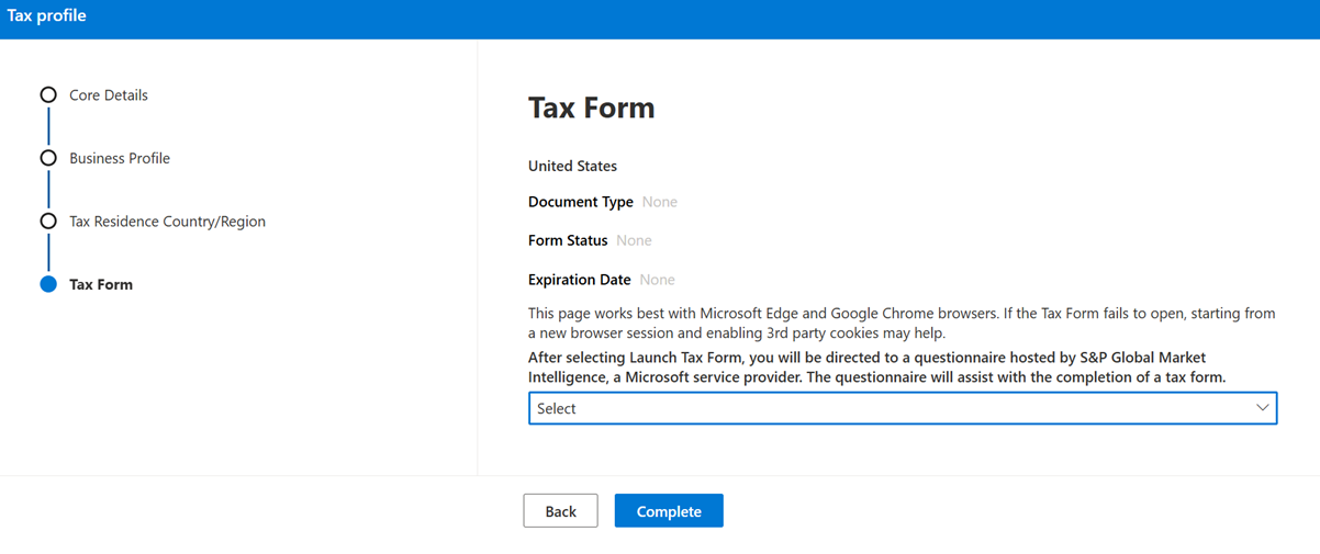 Debe rellenar los formularios fiscales de Estados Unidos para vender cualquier oferta o complemento transaccionable a través de Microsoft Marketplace, independientemente de su país o región de residencia o ciudadanía. Para ver un tutorial de vídeo de los pasos para configurar un perfil fiscal, consulte el siguiente vídeo Sobre cómo dominar Marketplace .