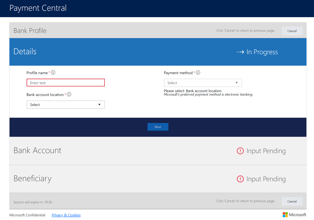 En la página Perfil de banco , proporcione la información necesaria sobre su banco.