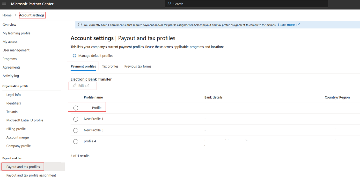 - Los perfiles de pago aparecen junto con su estado. Busque el perfil que desea editar y seleccione Editar. Puede aparecer un mensaje que muestra el mensaje "Se le redirige a otro sitio de Microsoft para completar los detalles", seleccione Continuar.