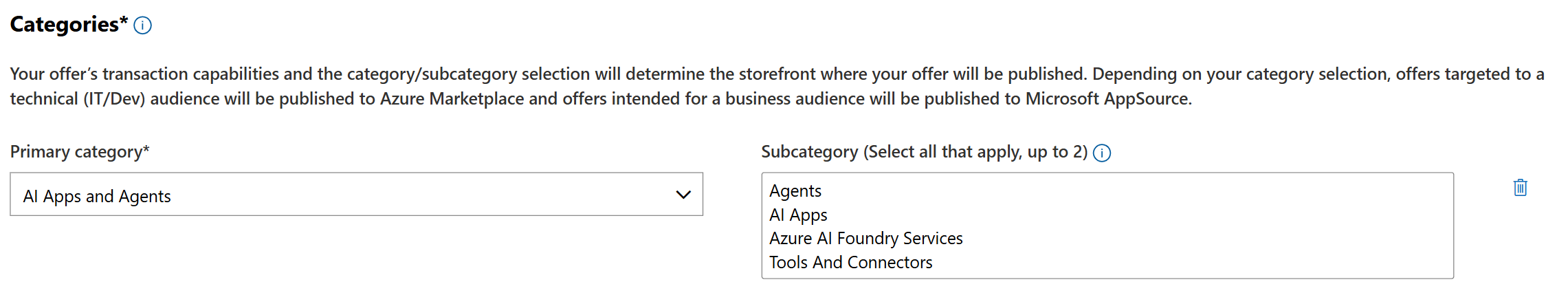 En esta sección se explica cómo crear una descripción para que los clientes puedan encontrar fácilmente el agente de IA. Detalles de la descripción: incluya un nombre de oferta, una descripción y un resumen del agente. Categorías: elija categorías y subcategorías que mejor se ajusten a la propuesta de valor del agente. Microsoft proporciona dos categorías centradas en la inteligencia artificial ( "Aplicaciones y agentes de IA" y "Machine Learning" ) para ayudar a los clientes a encontrar el agente. La selección de la categoría correcta garantiza que la oferta alcance el público adecuado.