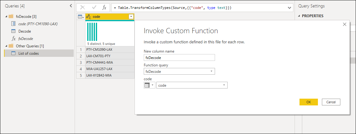 Las funciones personalizadas de Power Query se pueden crear a partir de consultas y parámetros existentes. Por ejemplo, imagine una consulta que tiene varios códigos como una cadena de texto y desea crear una función que descodifique esos valores.