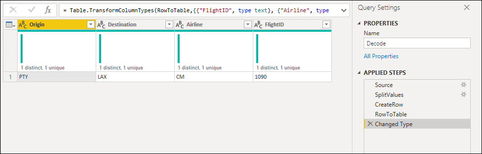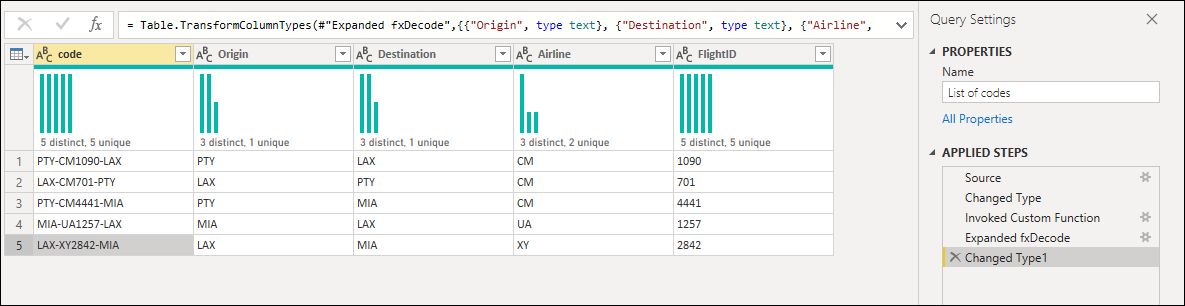 A partir de ese parámetro, se crea una nueva consulta en la que se aplican las transformaciones que necesita. En este caso, quiere dividir el código PTY-CM1090-LAX en varios componentes: