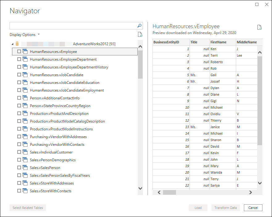 Cada conector de datos sigue una experiencia estándar, como se explica en Obtención de datos. Esta experiencia estandarizada tiene una fase denominada Vista previa de datos. En esta fase, se le proporciona una ventana fácil de usar para seleccionar los datos que desea obtener del origen de datos, si el conector lo permite y una vista previa de datos simple de esos datos. Incluso puede seleccionar varios conjuntos de datos desde el origen de datos a través de la ventana Navegador .