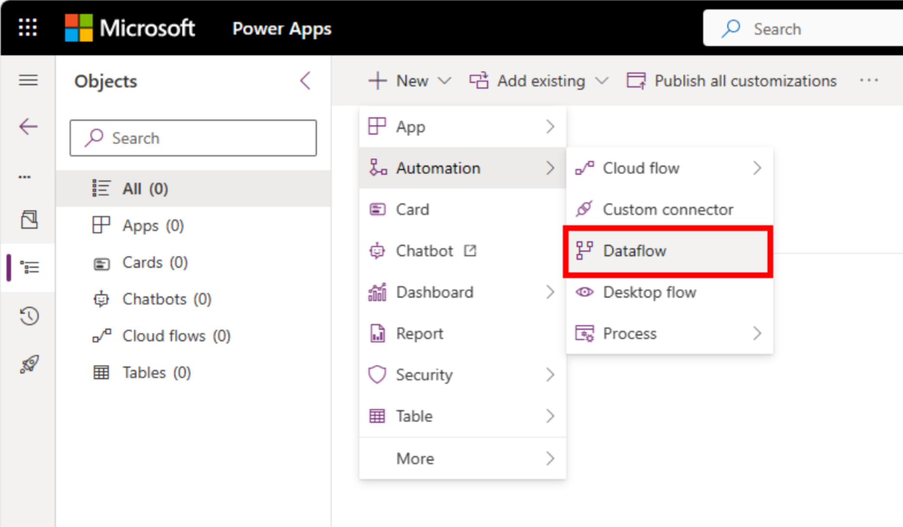 - Debe crear una solución antes de que pueda agregarle un flujo de datos. Más información: Crear soluciones