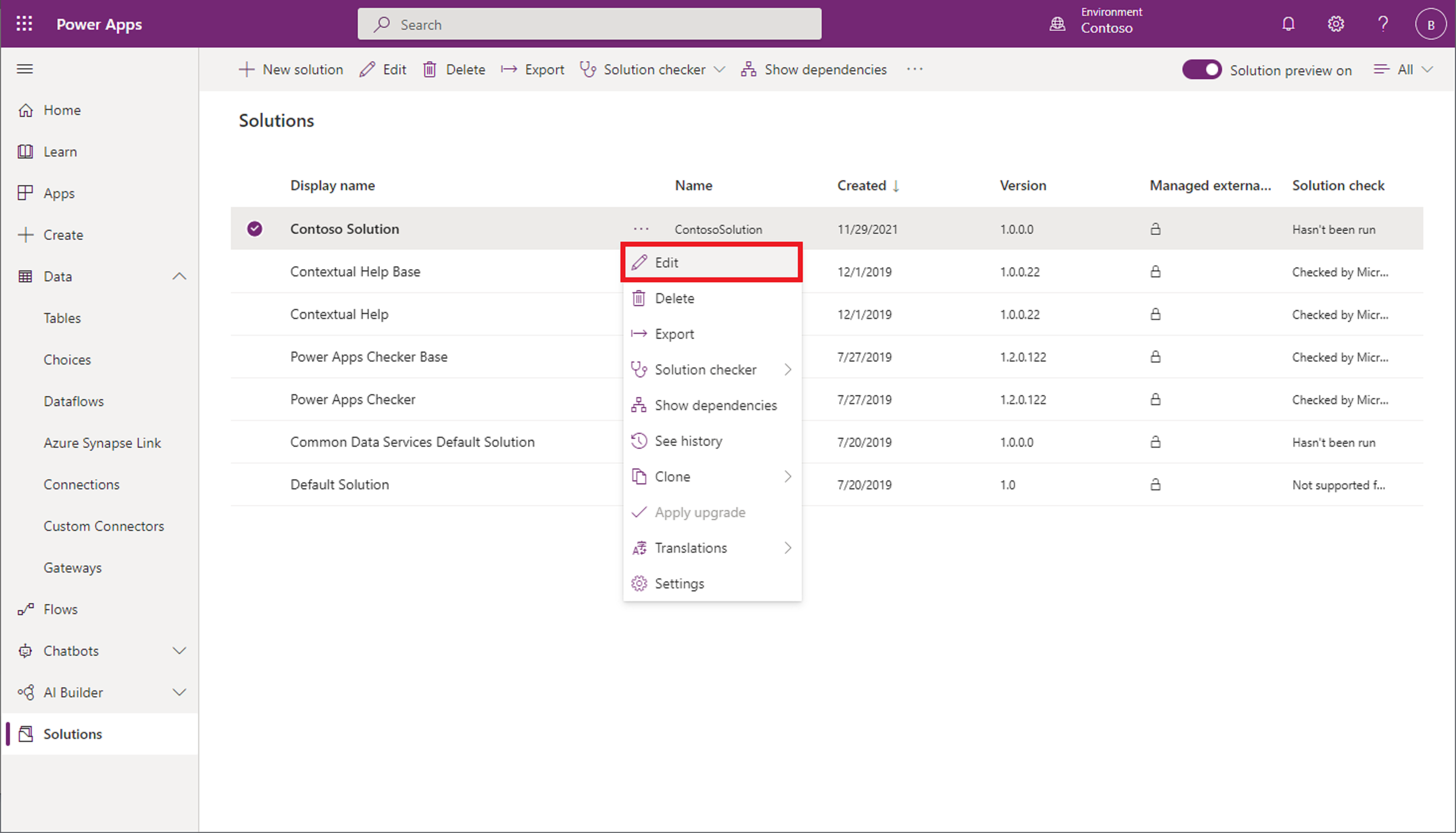 Seleccione la solución a la que agregará el flujo de datos y, en el menú contextual, seleccione Editar.