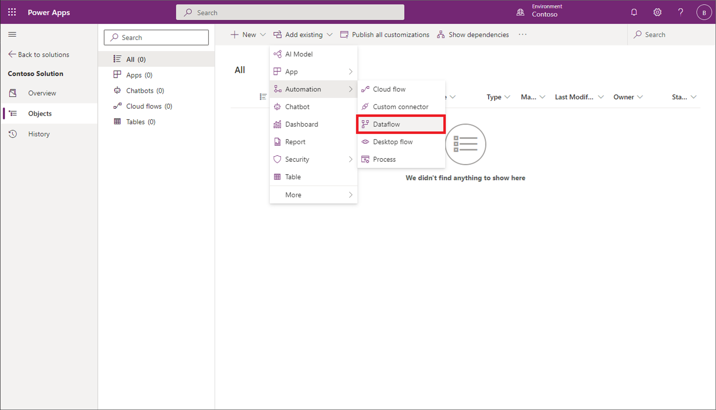 Debe crear una solución antes de que pueda agregarle un flujo de datos. Más información: Crear soluciones