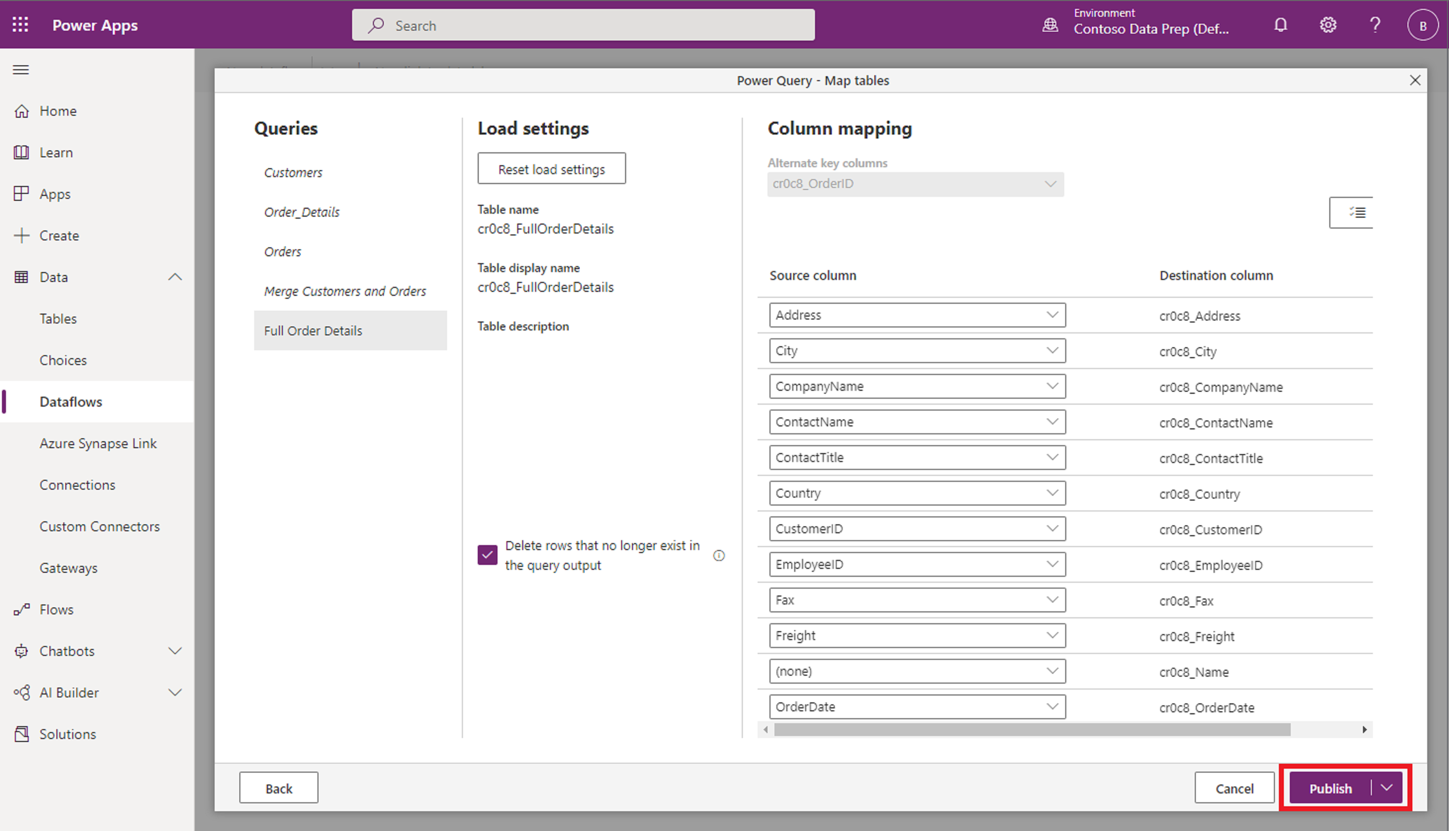 La configuración de asignación también se guarda como parte de la solución. Puesto que también ha agregado la tabla de destino a las soluciones, no es necesario volver a crear la tabla en este entorno y puede publicar el flujo de datos.