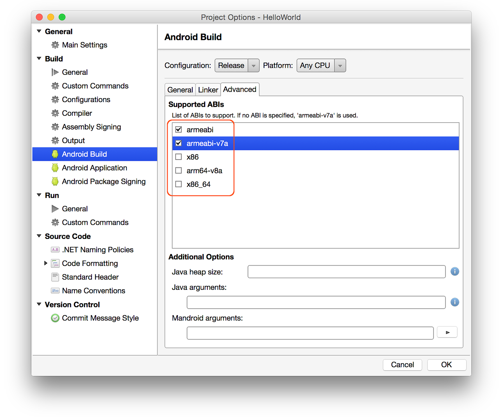 En Visual Studio para Mac, las arquitecturas admitidas se pueden seleccionar en la página Compilación de Android de Opciones del proyecto, en la pestaña Avanzadas, como se muestra en la siguiente captura de pantalla: