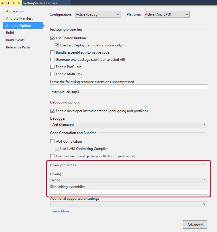 Muchas de estas propiedades, como Usar tiempo de ejecución compartido y Usar implementación rápida están pensadas para el modo de depuración. Sin embargo, cuando la aplicación está configurada para el modo de versión, hay otras opciones que determinan cómo se optimiza la aplicación para la velocidad de tamaño y ejecución, cómo está protegida contra alteraciones y cómo se puede empaquetar para admitir diferentes arquitecturas y restricciones de tamaño.