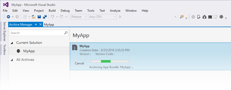 Archivo para publicación : este paso compila la aplicación y la coloca en un archivo para firmar y publicar.