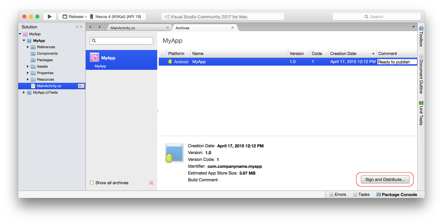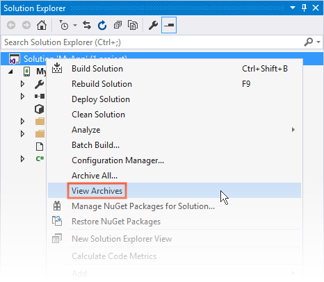 Otra manera de crear un archivo es hacer clic con el botón derecho en la solución en el Explorador de soluciones y seleccionar Archivar todo..., que compila la solución y archiva todos los proyectos de Xamarin que pueden generar un archivo: