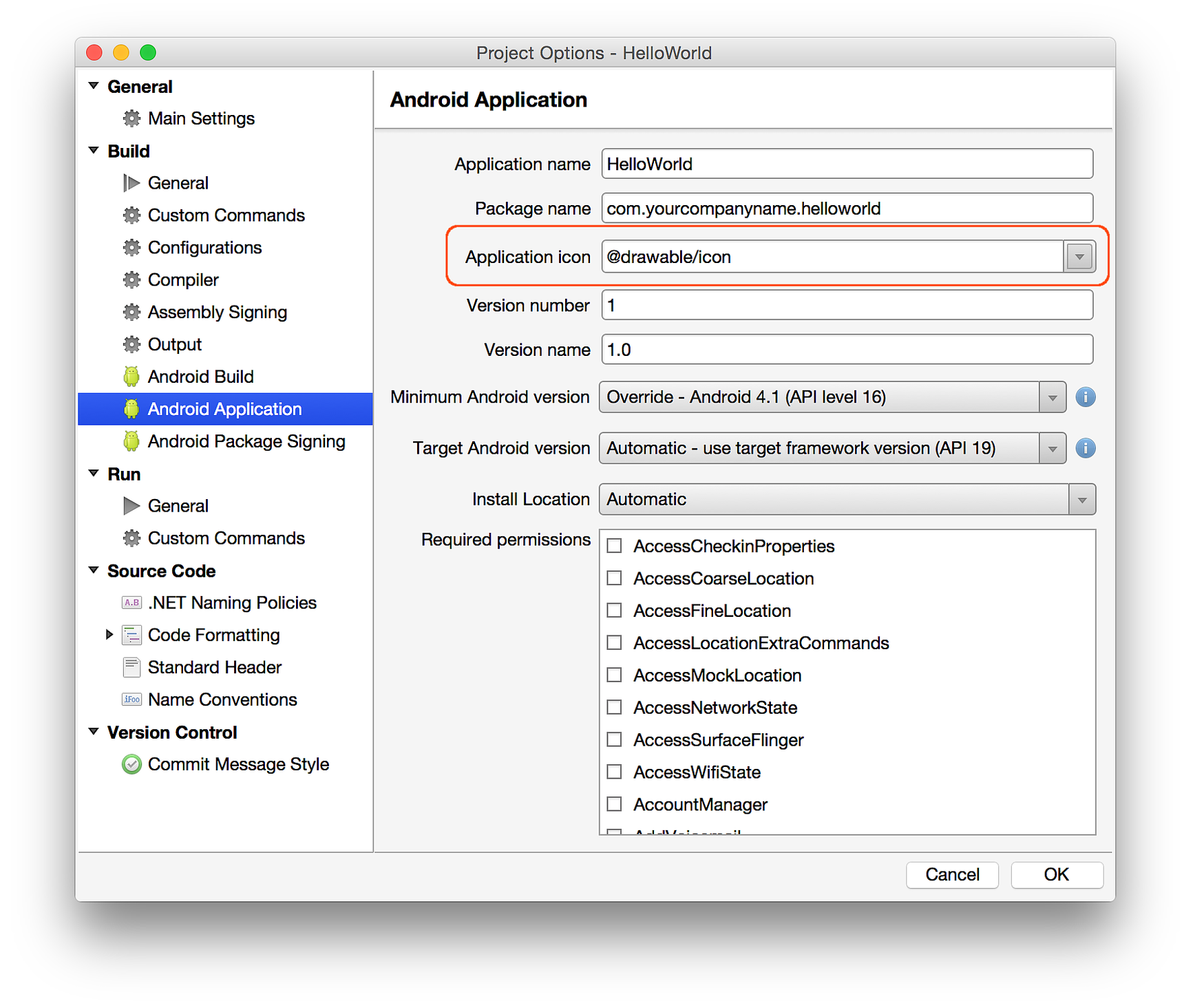 Especifique el icono de aplicación : cada aplicación de Xamarin.Android debe tener especificado un icono de aplicación. Aunque técnicamente no es necesario, algunos mercados, como Google Play, lo requieren.