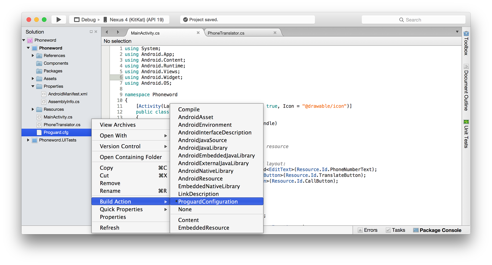 Cuando se activa Habilitar ProGuard , Xamarin.Android ejecuta la herramienta ProGuard en el APK resultante. ProGuard genera y usa un archivo de configuración de ProGuard en tiempo de compilación. Xamarin.Android también admite acciones de compilación personalizadas de ProguardConfiguration . Puede agregar un archivo de configuración de ProGuard personalizado al proyecto, hacer clic con el botón derecho en él y seleccionarlo como una acción de compilación, como se muestra en este ejemplo: