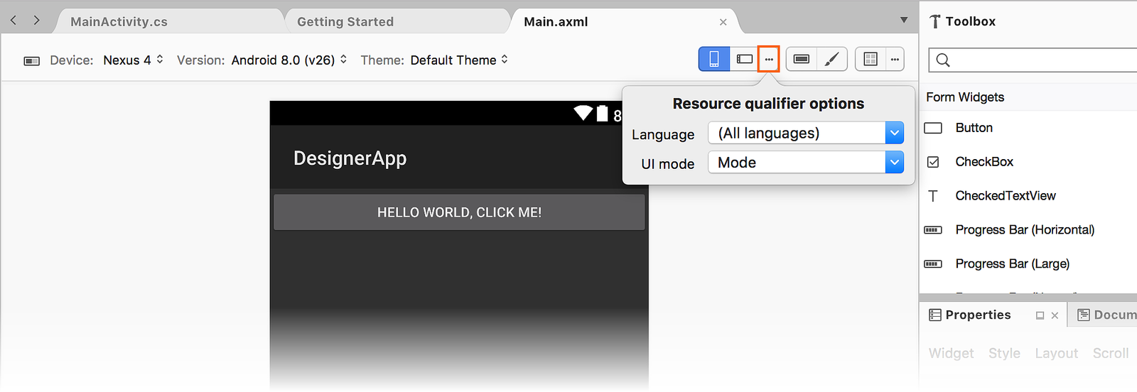 El conjunto de widgets disponibles en el cuadro de herramientas viene determinado por la versión del marco de destino del proyecto. Esto también es cierto para las propiedades disponibles en la ventana de Propiedades. La lista disponible de widgets no viene determinada por el valor seleccionado en el selector Versión de la barra de herramientas. Por ejemplo, si establece la versión de destino del proyecto en Android 4.4, todavía puede seleccionar Android 6.0 en el selector de versiones de la barra de herramientas para ver el aspecto del proyecto en Android 6.0, pero no podrá agregar widgets específicos de Android 6.0, todavía estará limitado a los widgets que están disponibles en Android 4.4.
