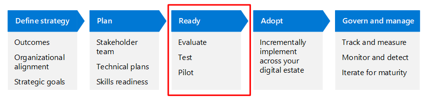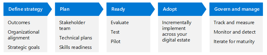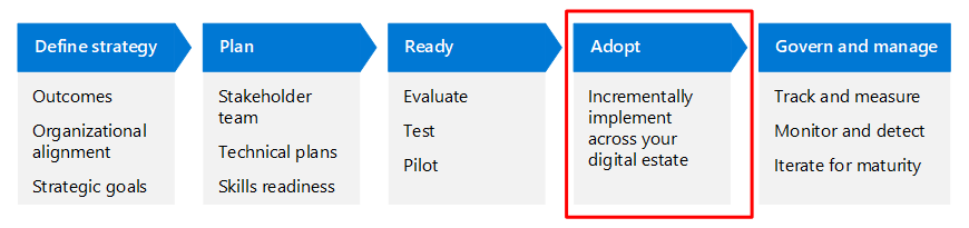 En este artículo se explica este escenario empresarial con las mismas fases de ciclo de vida que Cloud Adoption Framework para Azure (definir estrategia, planear, preparar, adoptar y administrar), pero adaptadas para Confianza cero.
