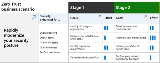 Comprenda fácilmente las mejoras de seguridad para cada escenario empresarial y el nivel de esfuerzo de las fases y objetivos de la fase de plan. | Líderes de proyectos de escenarios de negocio, líderes empresariales y otras partes interesadas. |