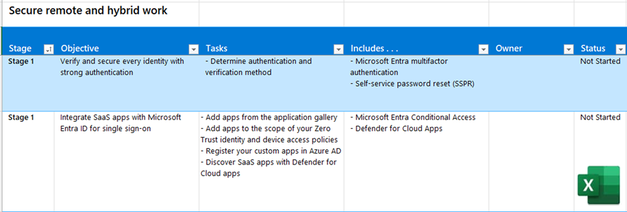 - Documente los objetivos y planifique la adopción incremental en función de las prioridades. Un ejemplo consiste en proteger identidades y servicios de Microsoft 365 y, después, puntos de conexión. A continuación, proteja aplicaciones y servicios SaaS mediante métodos de autenticación modernos y funcionalidades de segmentación proporcionadas por el acceso condicional.