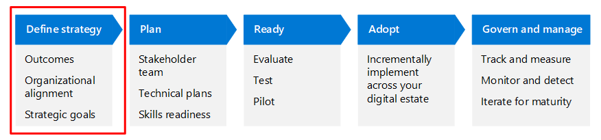 La Definir la estrategia fase es fundamental para definir y formalizar nuestros esfuerzos para abordar el "Por qué?" de este escenario. En esta fase, entendemos el escenario a través de perspectivas empresariales, operativas, estratégicas y de TI.