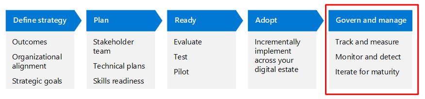 | Definición de la estrategia | Planificación | Listo | Adoptar | Gobernanza y administración |