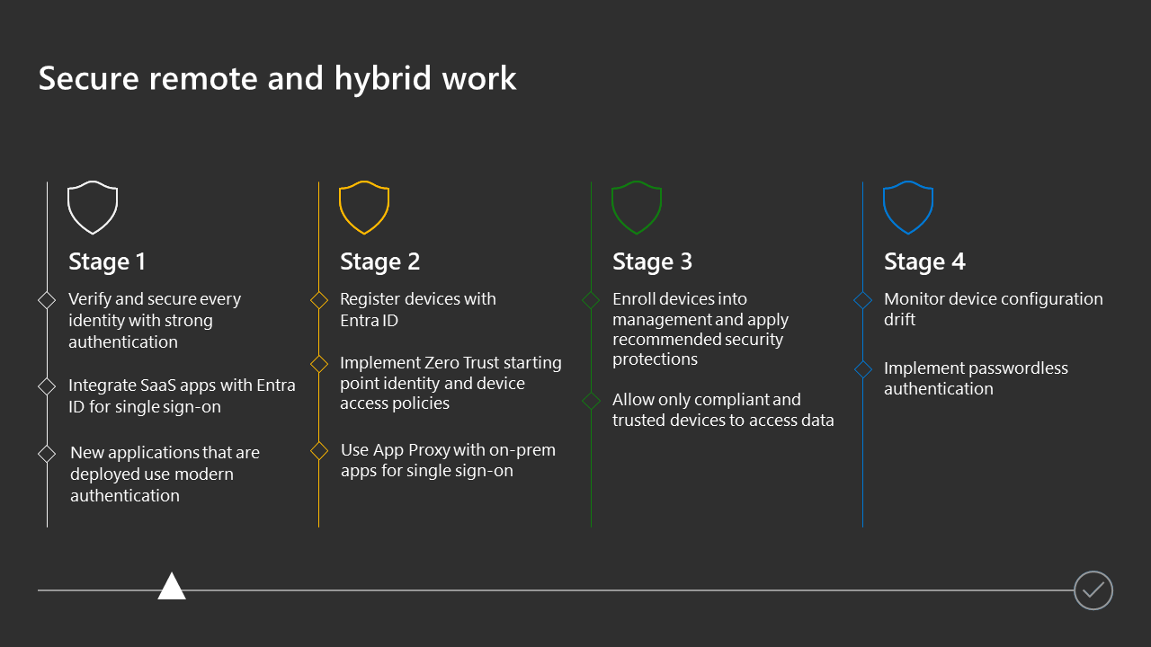 La adopción técnica para proteger el trabajo remoto e híbrido implica adoptar un enfoque graduado para garantizar que los principios de Confianza cero se apliquen a las identidades, dispositivos y aplicaciones al exigir lo siguiente: