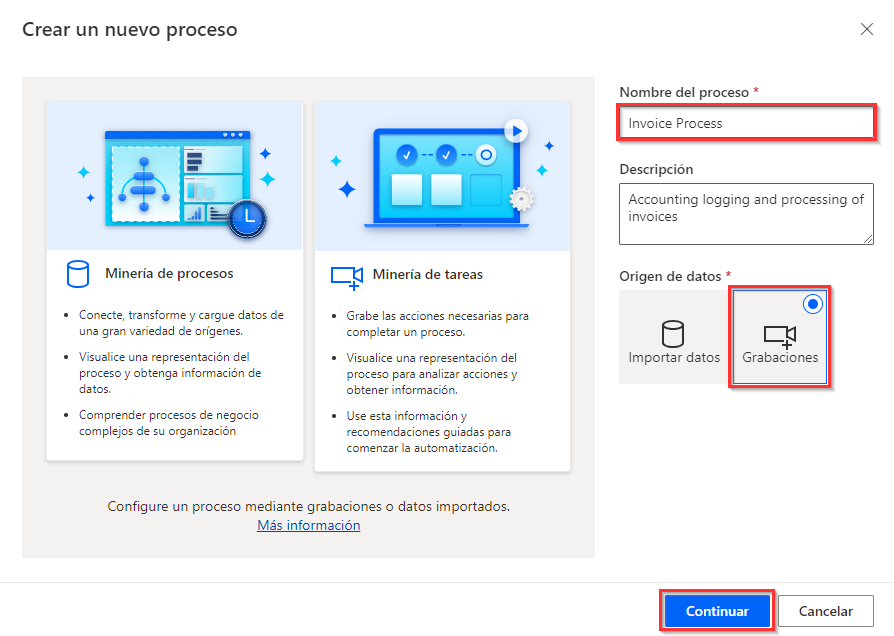 Para comenzar a registrar un proceso de negocio, solo tiene que seleccionar Empezar aquí en la pantalla de minería de procesos y seleccionar Registros. Luego, añada un Nombre de proceso y seleccione Continuar.