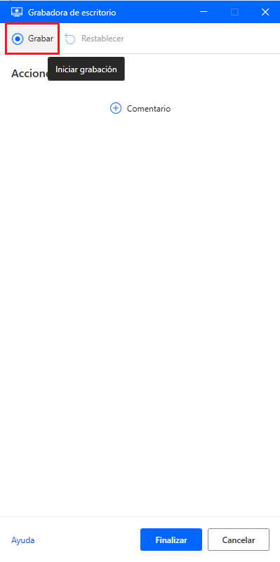 Se abrirá la ventana Grabadora de escritorio de Power Automate para escritorio. Antes de comenzar a grabar, debe completar algunos elementos de limpieza. El proceso irá más fluido si se sale de aplicaciones innecesarias mientras se graba. Si tiene otros navegadores o programas en ejecución, debería cerrarlos ahora. Será difícil leer las instrucciones y realizar las acciones necesarias para la grabación de forma simultánea. Por ello, puede que le interese leer esta unidad por completo antes de realizar los pasos siguientes. Después de completar los elementos de limpieza, estará listo para comenzar a grabar. Para empezar, seleccione el botón Iniciar grabación en Power Automate para escritorio.