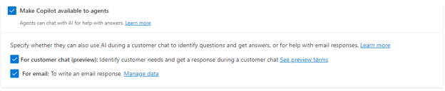 Tras activar Poner Copilot a disposición de los agentes, habrá otras dos opciones disponibles.