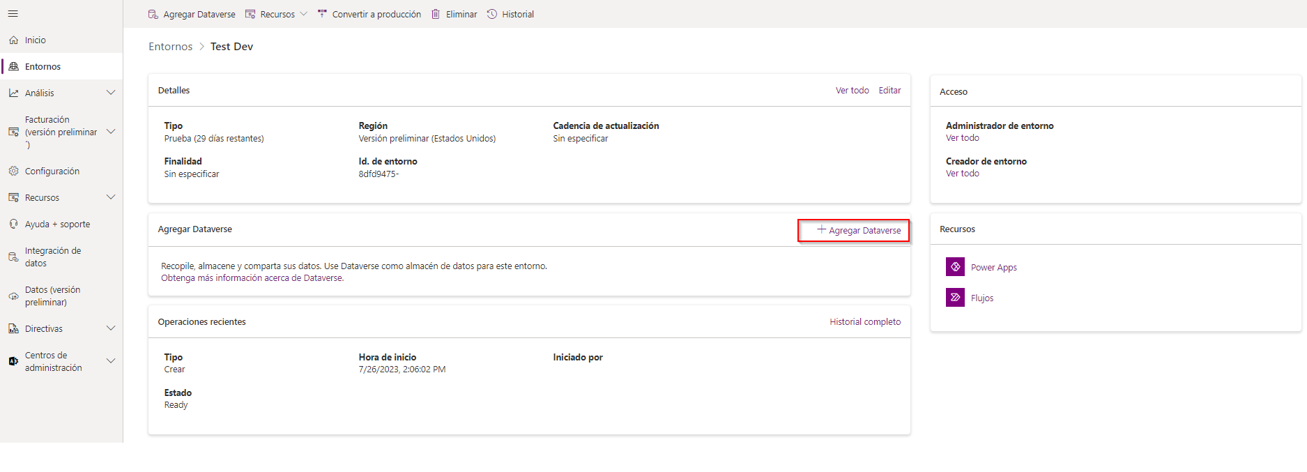 En la pantalla Detalles del entorno, verá que hay un panel Agregar Dataverse en el centro de la pantalla. Seleccione Agregar Dataverse.