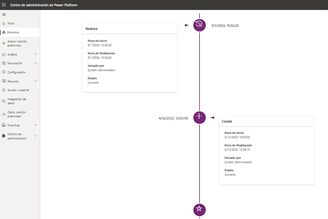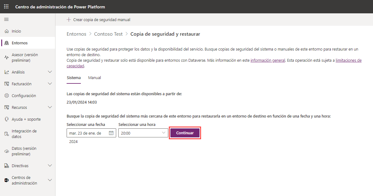 Si utiliza Microsoft Power Platform para crear entornos de producción que tienen una base de datos y aplicaciones Dynamics 365 habilitadas, puede beneficiarse de las copias de seguridad del sistema que se hacen automáticamente para esos entornos. Las copias de seguridad del sistema se almacenan hasta durante 28 días.