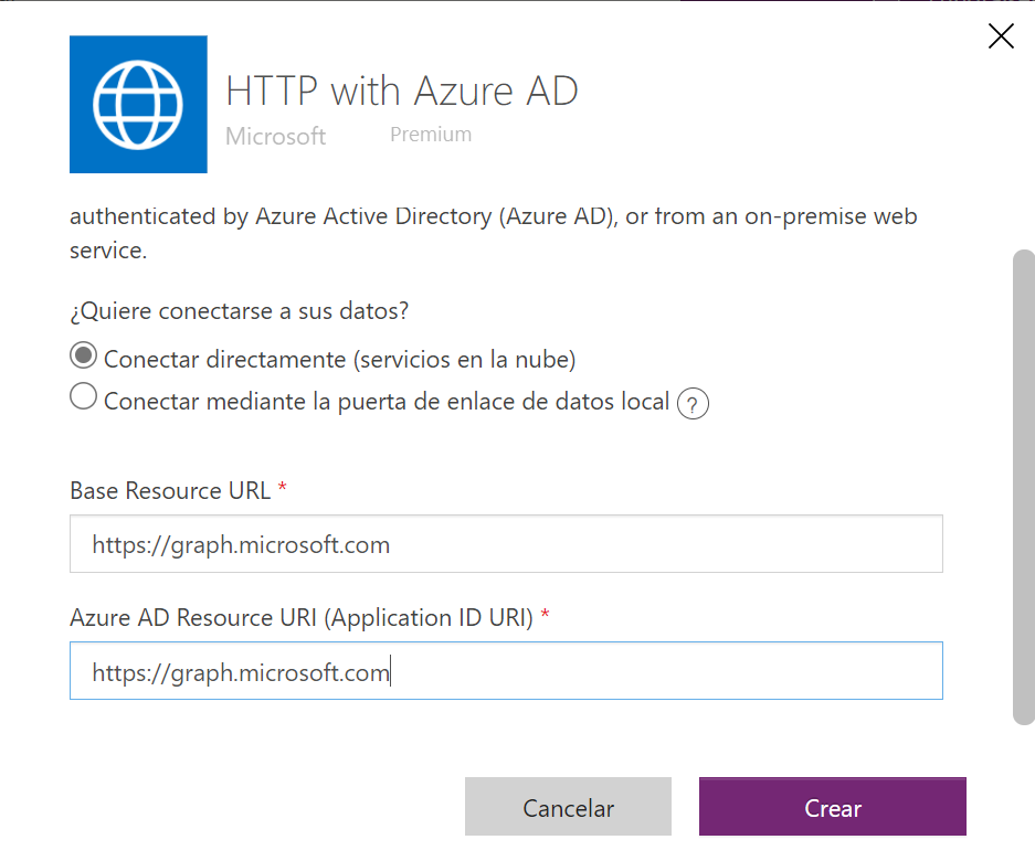Cree una conexión para HTTP con Microsoft Entra ID y establezca URL del recurso base y URI de recurso de Entra ID (URI de Id. de aplicación) en