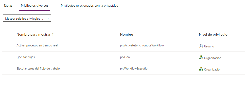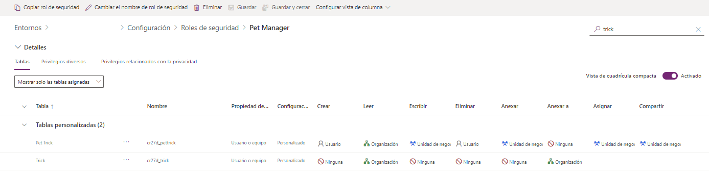La siguiente captura de pantalla muestra los privilegios y niveles de acceso a las tablas desde el Centro de administración de Power Platform.