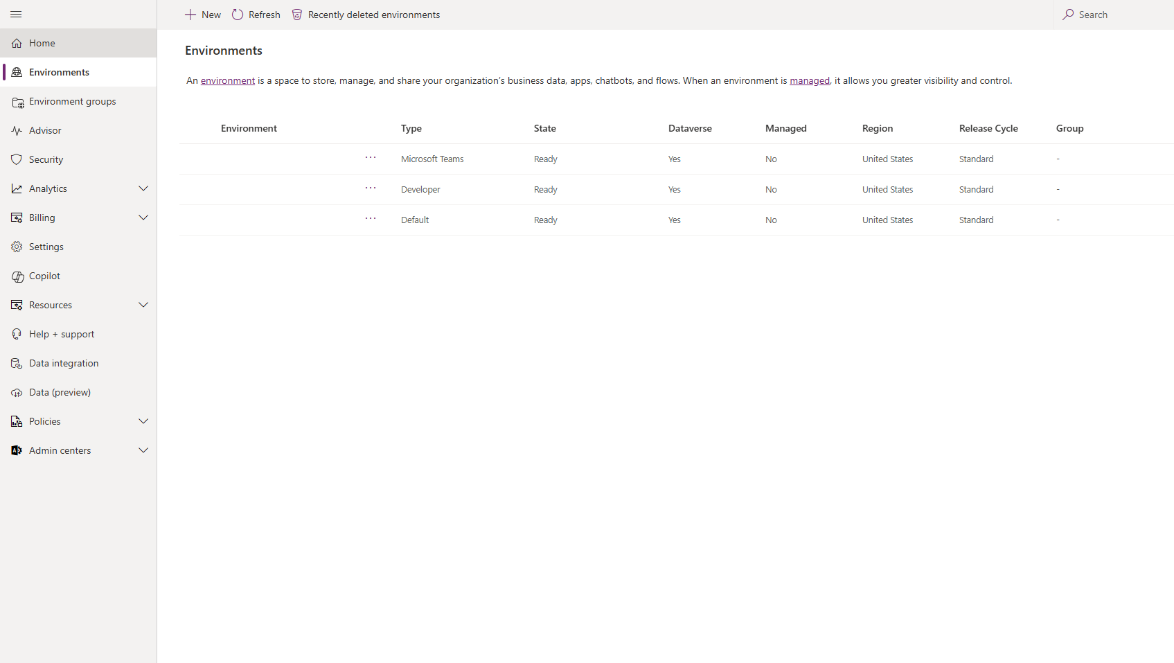 Se pueden crear entornos adicionales, normalmente, para permitir el acceso por inclusión. Algunas organizaciones optan por cambiar el nombre del entorno predeterminado, como Productividad personal, lo que indica su propósito de crear flujos que mejoren la productividad personal.