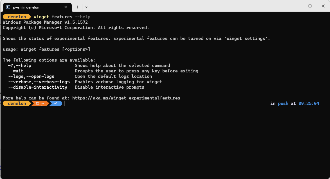 El comando features de la herramienta winget muestra una lista de las características experimentales disponibles, junto con la versión del Administrador de paquetes de Windows.
