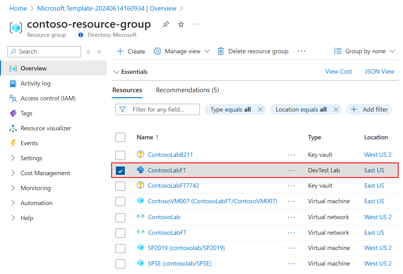 Stránka Skupina prostředků obsahuje seznam prostředků ve skupině prostředků, včetně nového testovacího prostředí a závislých prostředků, jako jsou virtuální sítě a virtuální počítače. Pokud chcete otevřít stránku Přehled testovacího prostředí, vyberte prostředek DevTest Lab pro nové testovací prostředí v seznamu: