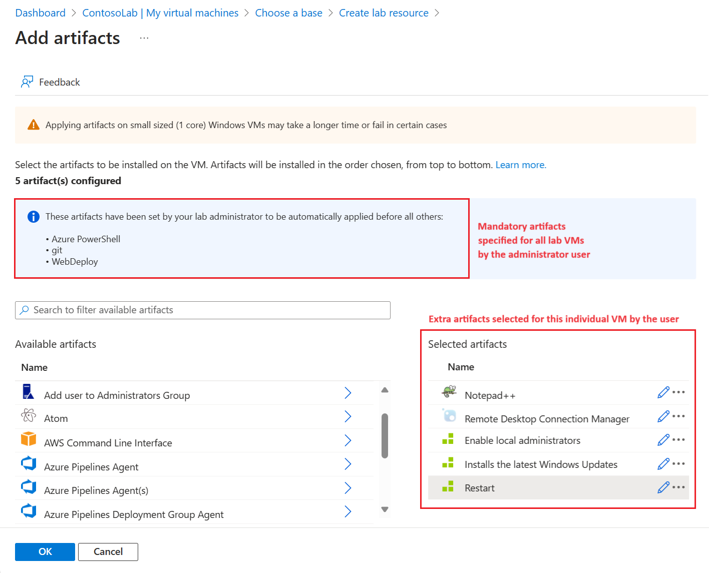 Po zadání povinných artefaktů pro testovací prostředí zobrazí DevTest Labs povinné artefakty pro všechny virtuální počítače testovacího prostředí na základě operačního systému (Windows nebo Linux). Když uživatel testovacího prostředí vytvoří nový virtuální počítač, uvidí povinné artefakty, které DevTest Labs plánuje nainstalovat.